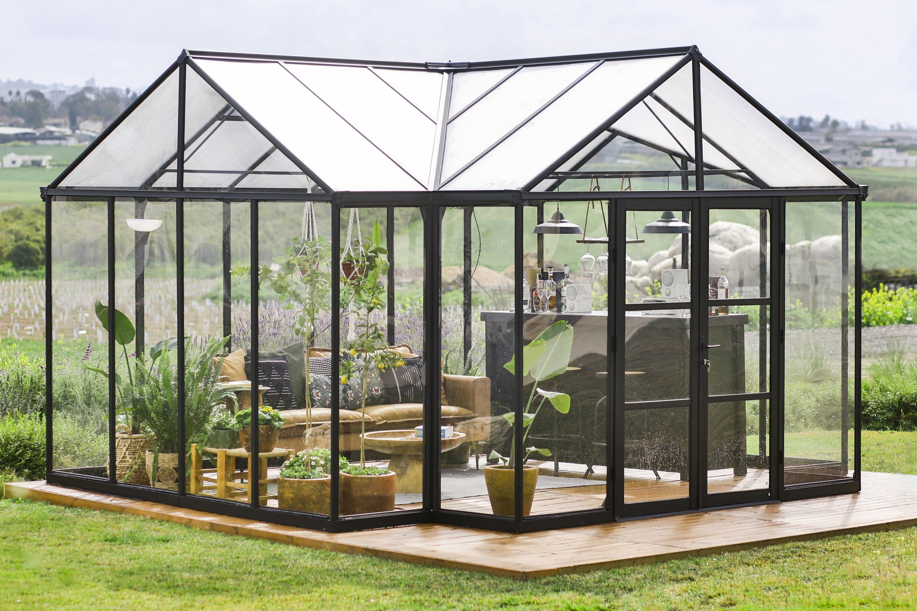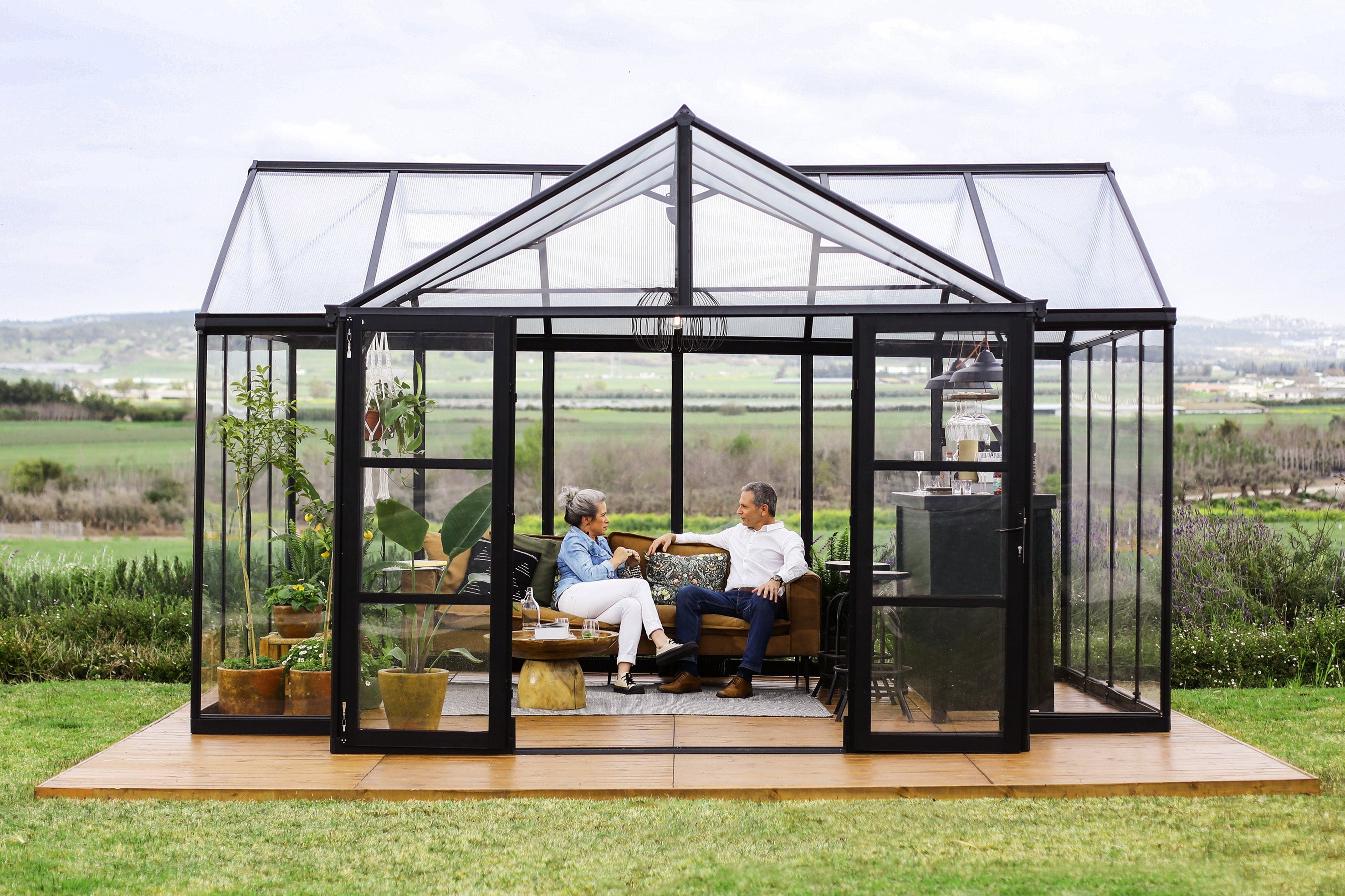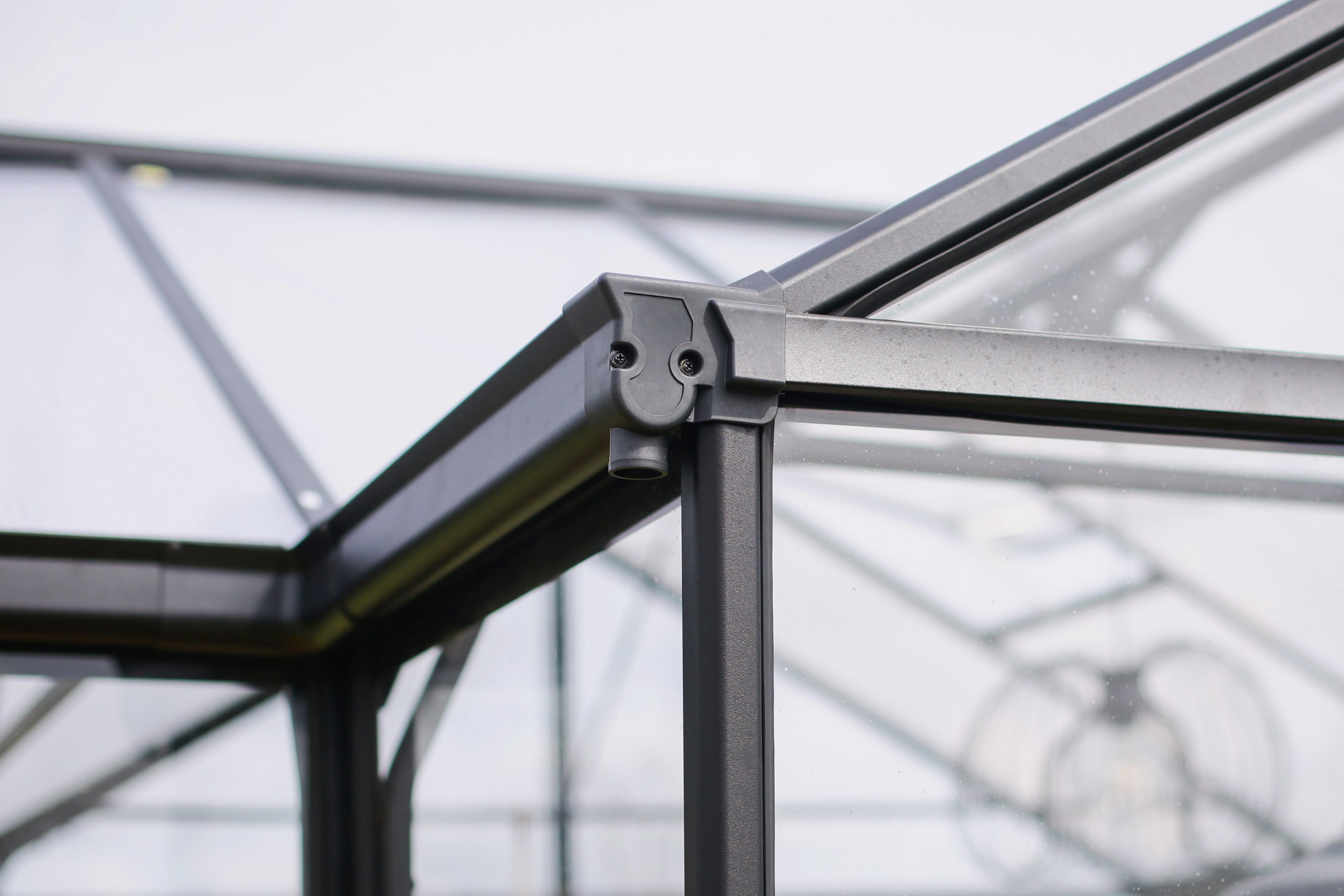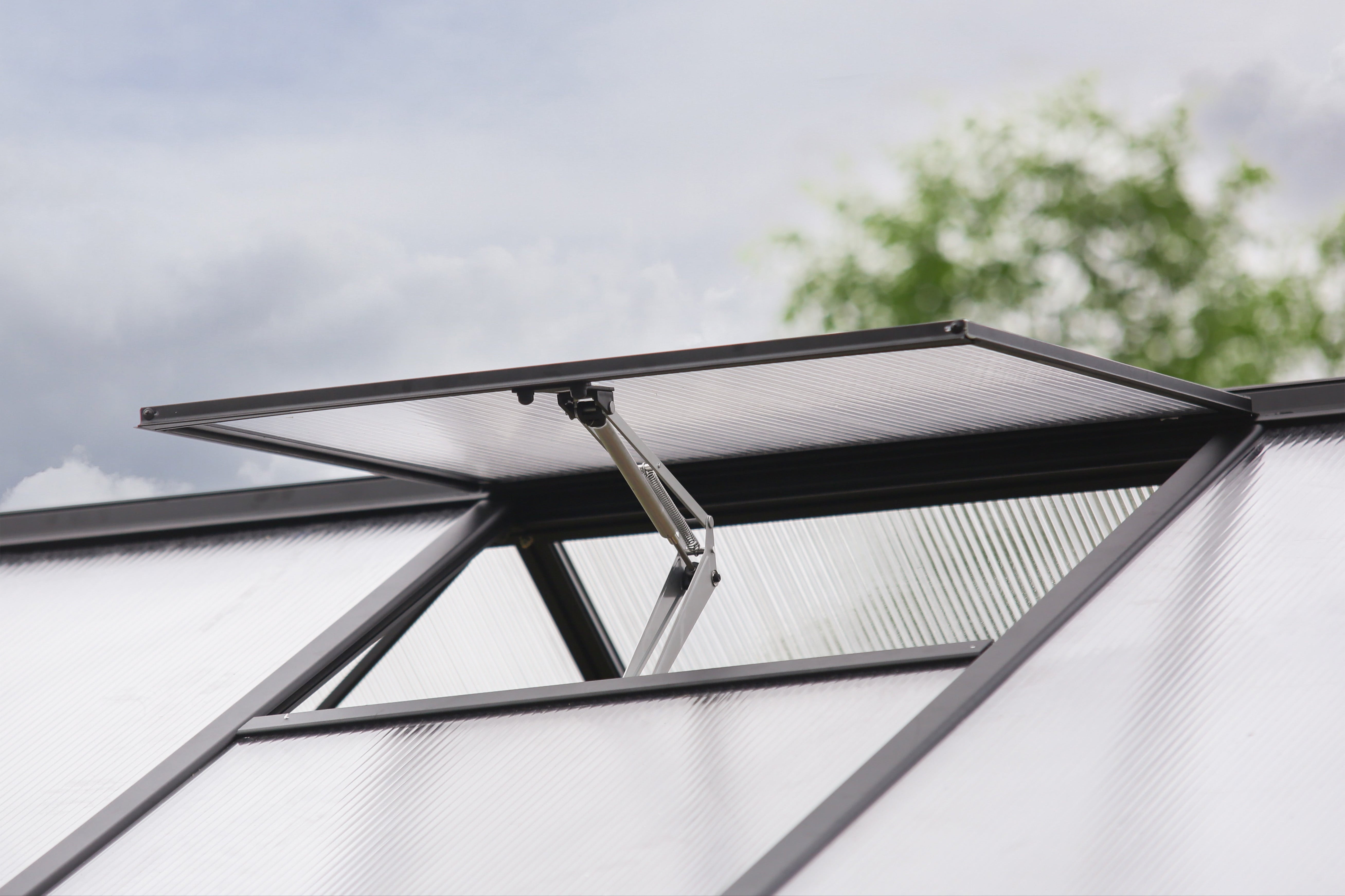 The solid acrylic glazing reduces exterior noise and is exceptionally safe. The aluminium frame has a modern black finish and is strong enough to hold shelves inside your greenhouse for plants, decorations, books, or crockery.